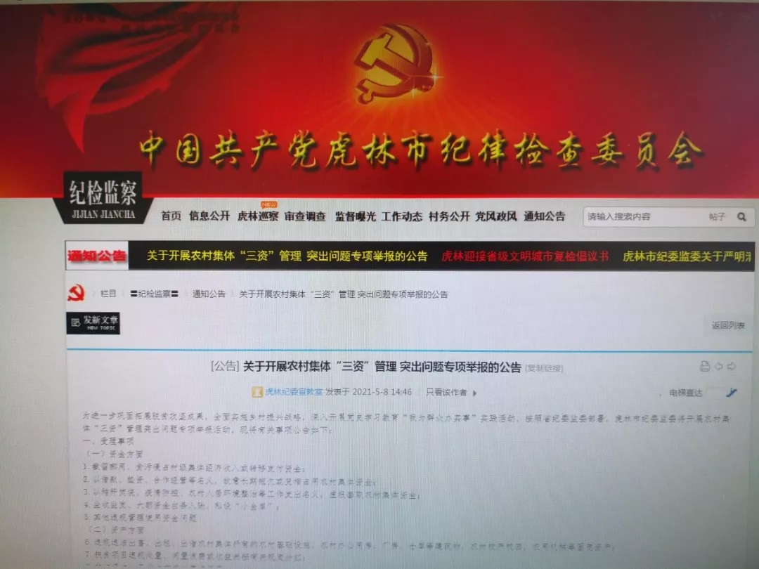 虎林市纪委监委按照省、市纪委监委的相关要求,制发《关于开展农村集体“三资”管理突出问题专项监督检查的工作通知》,成立工作领导小组,明确责任分工和各阶段工作任务及时间节点,严格督促主体责任落实。由虎林市农业农村局统筹推进“三资”管理自查自清工作。利用媒体发布《关于开展农村集体“三资”管理突出问题专项举报公告》,对全市11个乡镇的“三资”管理进行专项监督检查,对发现的问题和薄弱环节,进一步健全完善各项规章制度,堵塞管理漏洞,形成规范的农村集体资产财务管理长效机制。涉嫌违纪违法问题及时核查,严肃处理。