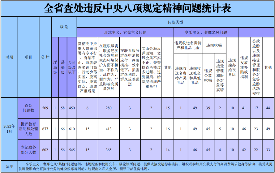 2022年1月,全省纪检监察机关共查处违反中央八项规定精神问题509起,批评教育帮助和处理677人,其中党纪政务处分602人。