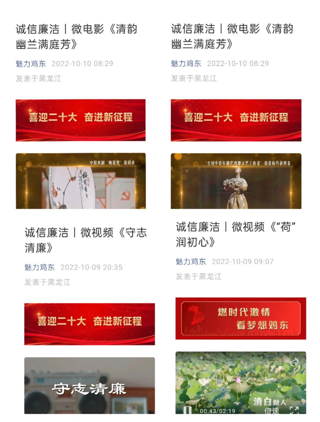 鸡东县梧桐广场的电子屏,专门进行“红灯记”及红色经典宣传,悬挂宣传图板,大力营造廉洁文化氛围。在当地主流媒体开展全覆盖宣传,发布《清韵幽兰满庭芳》《坚守底线》《守志清廉》等廉洁文化影视作品20余个,发布“荷润初心”“第一粒扣子”等廉洁文化视频10余条,推动红色教育与廉洁文化深度融合,在思想引领、传承浸润、传播实效上不断取得新突破。