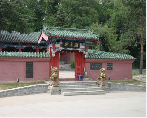 位于虎头山下的关帝庙,基长17米,高4.54米,木质建筑;四周花墙,庙顶黑瓦覆盖,重檐飞角,斗拱交错。庙门两侧悬挂一副对联,上联:知我者其惟春秋乎;下联:乃所愿则学孔子也。
