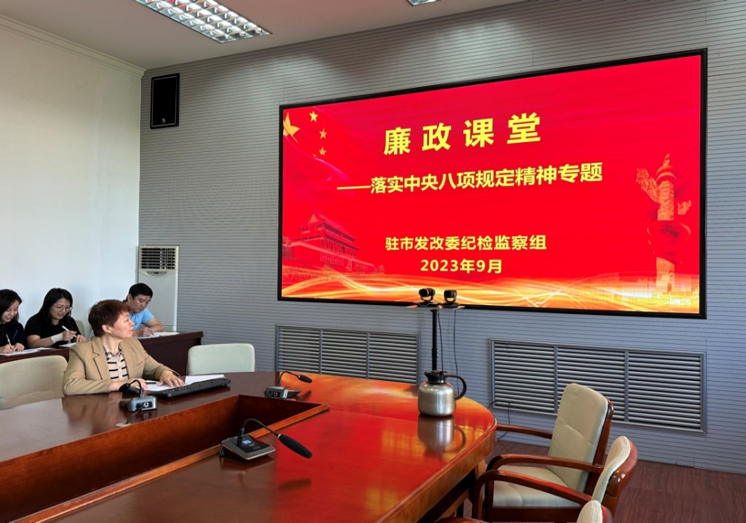 ▲图为驻市发改委纪检监察组开设“廉政课堂”,为被监督单位百余名党员干部详细解析违反中央八项规定精神问题类型和表现,引导党员干部系好“廉洁扣”。