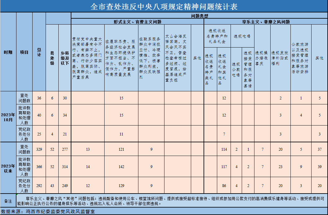 11月22日,鸡西市纪委监委公布2023年10月全市查处违反中央八项规定精神问题汇总情况。今年10月,全市共查处违反中央八项规定精神问题36起,批评教育帮助和处理40人,党纪政务处分25人。