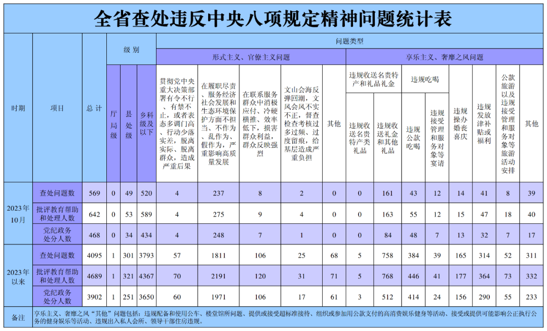 2023年10月,全省纪检监察机关共查处违反中央八项规定精神问题569起,运用“四种形态”批评教育帮助和处理642人,其中党纪政务处分468人。