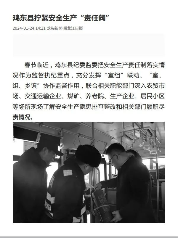1月24日,《龙头新闻》刊文《鸡东县拧紧安全生产“责任阀”》,报道鸡东县纪委监委相关工作开展情况。