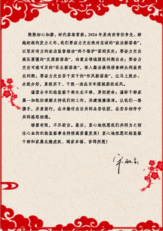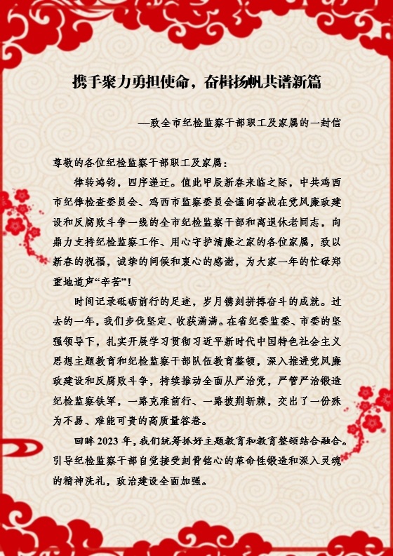 携手聚力勇担使命 奋楫扬帆共谱新篇——致全市纪检监察干部职工及家属的一封信-凯发娱乐