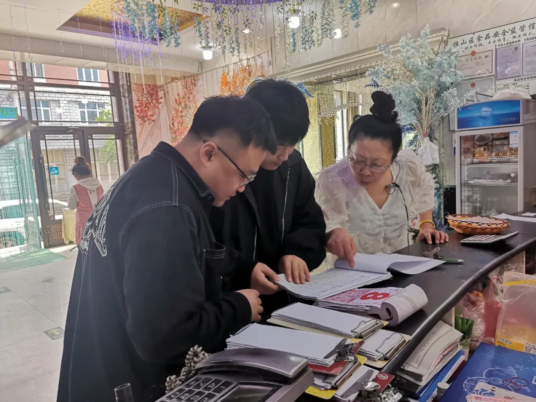 ▲恒山区纪委监委持续加固中央八项规定堤坝,组织纪检监察干部深入农贸市场、酒店商超等场所,开展明察暗访、随机抽查、大数据筛查,严防“四风”问题反弹回潮。图为该区纪检监察干部在某餐饮场所查阅订餐包席台账,对是否存在违规公款吃喝、接受管理服务对象宴请等问题开展监督。