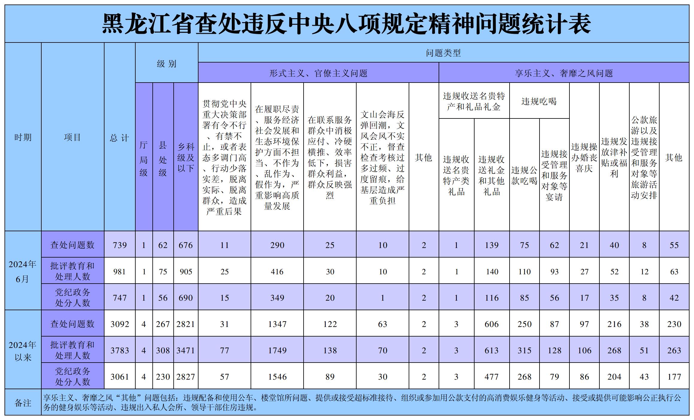 2024年6月,黑龙江省纪检监察机关共查处违反中央八项规定精神问题739起,批评教育和处理981人,其中党纪政务处分747人。