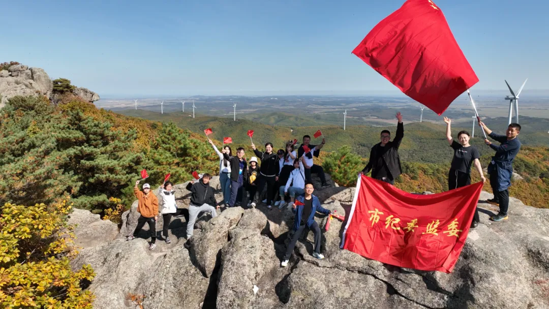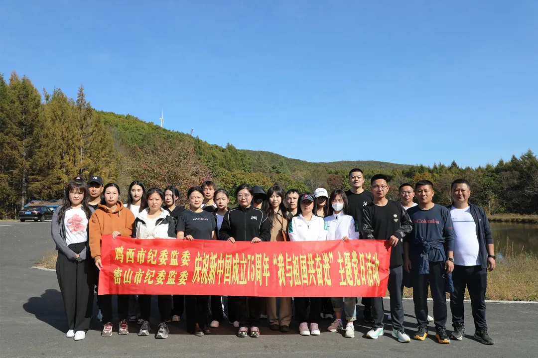 ▲图为鸡西市市县两级纪检监察干部登临蜂蜜山,庆祝新中国成立75周年。