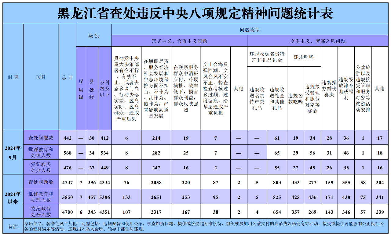2024年9月黑龙江省查处违反中央八项规定精神问题442起