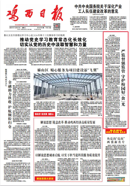 10月22日,《鸡西日报》一版“集中整治 办实事 解难题 惠民生”专栏刊文《严监督强监管 守护校园好“食”光》,报道群众身边不正之风和腐败问题集中整治开展以来,全市纪检监察机关紧盯校园学生餐全流程各环节,靶向发力、精准监督,以有力有效监督全力守护学生“盘中餐”相关工作。