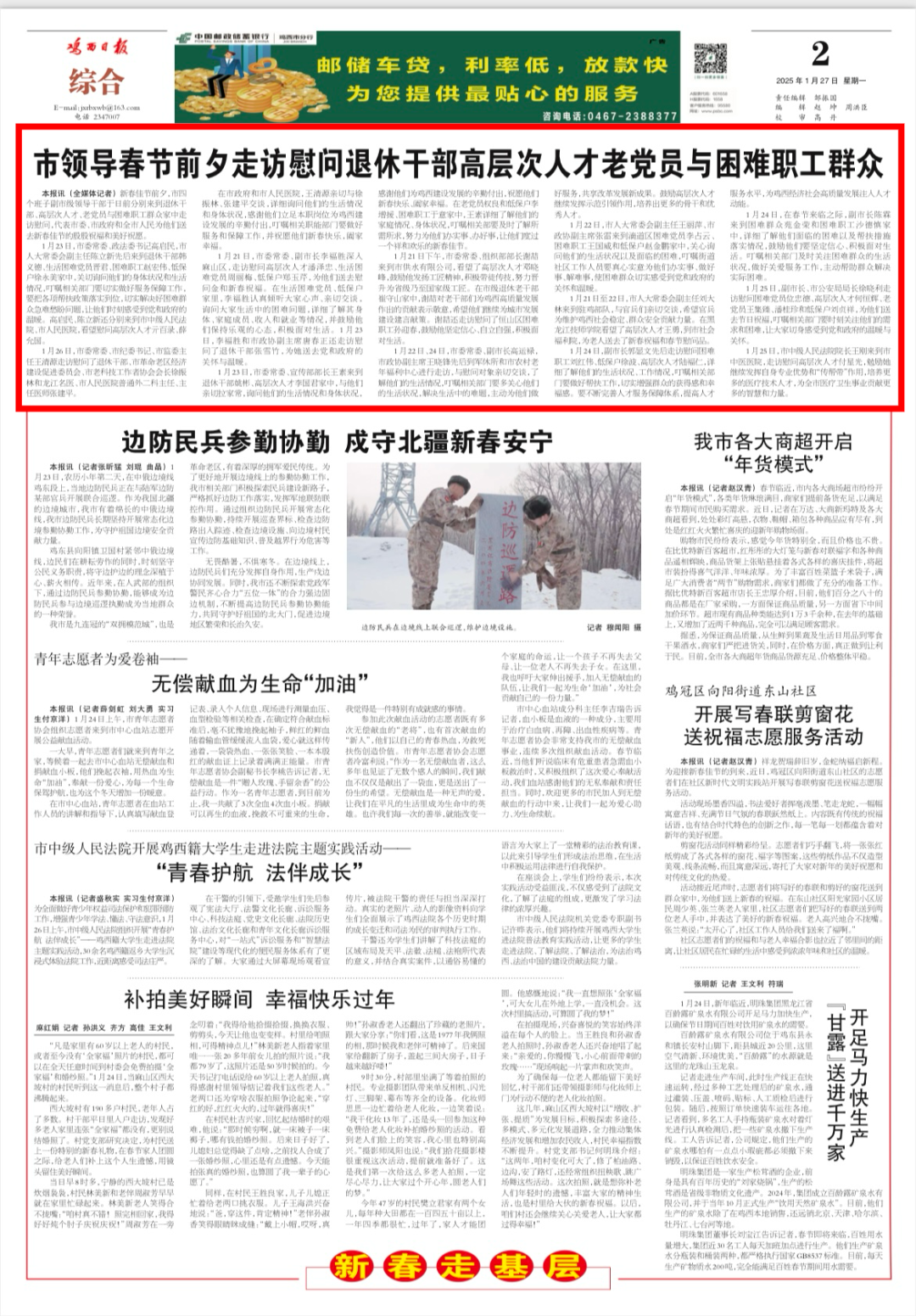 1月21日至22日,市人大常委会副主任刘大林来到驻鸡部队,与官兵们亲切交谈,希望官兵为维护鸡西社会稳定、群众安全贡献力量。在黑龙江技师学院看望了高层次人才王勇,到市社会福利院,为老人送去了新春祝福和春节慰问品。