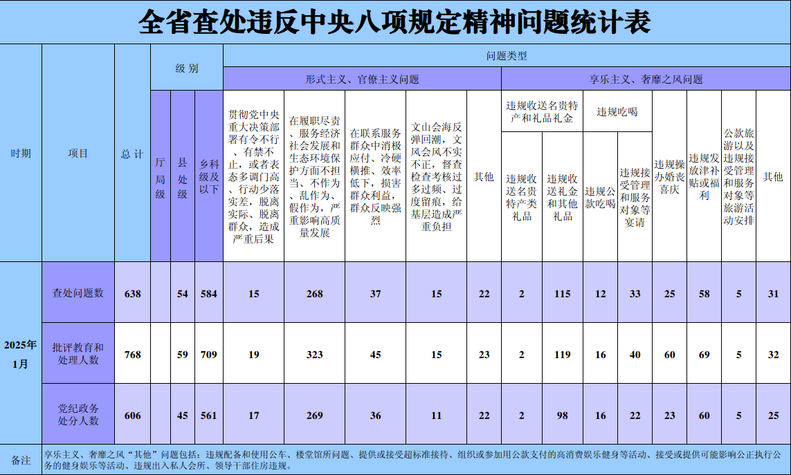 2025年1月黑龙江省查处违反中央八项规定精神问题638起