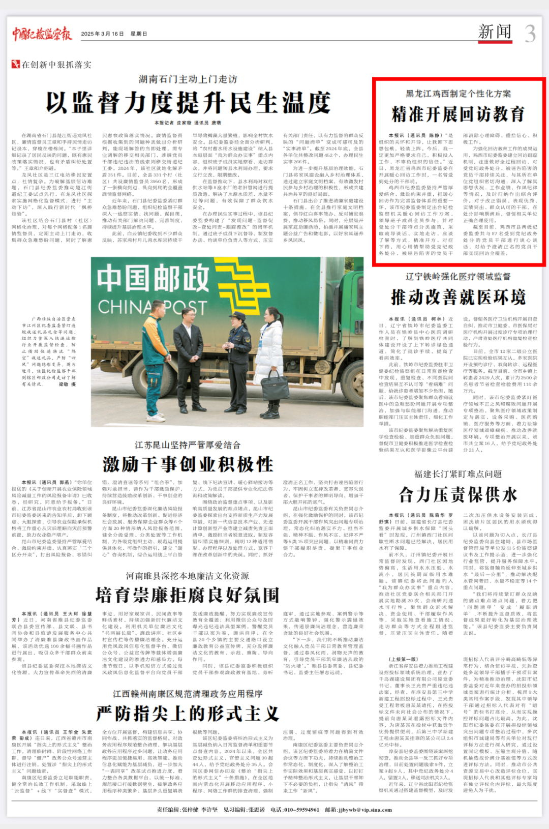3月16日,《中国纪检监察报》新闻版刊文《黑龙江鸡西制定个性化方案 精准开展回访教育》,报道鸡西市纪委监委坚持严管厚爱结合、激励约束并重,精准开展暖心回访工作情况。