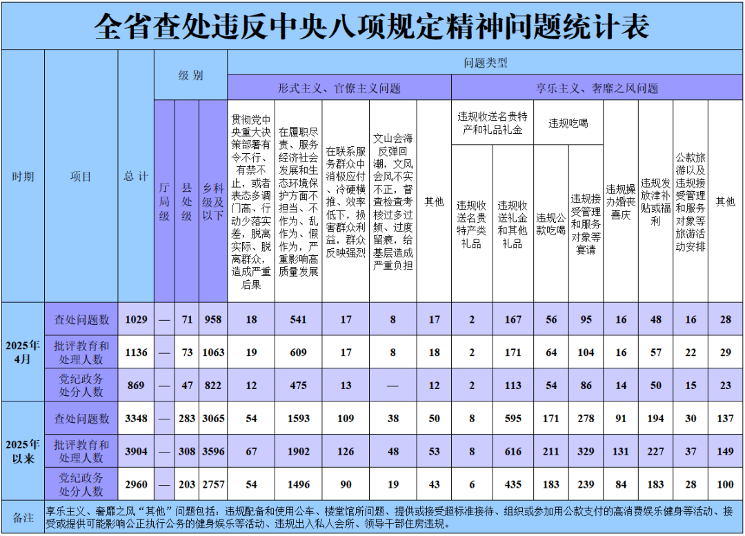 2025年4月,黑龙江省纪检监察机关共查处违反中央八项规定精神问题1029起,批评教育和处理1136人,其中党纪政务处分869人。