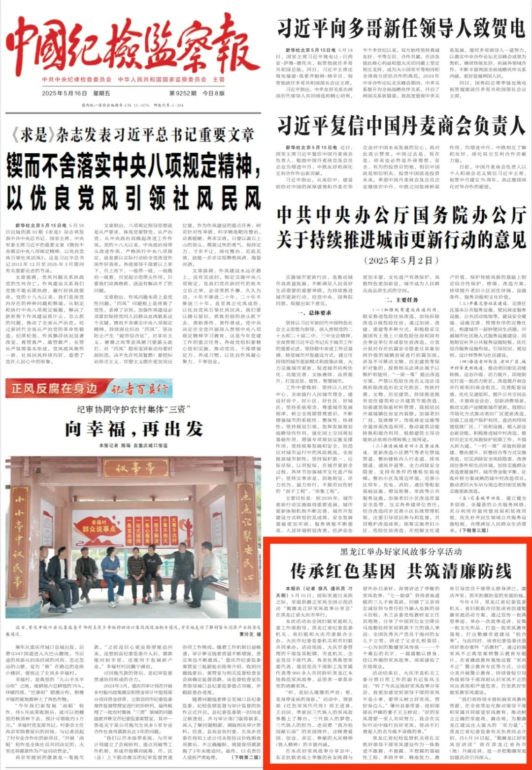 5月16日,《中国纪检监察报》一版刊文《黑龙江举办好家风故事分享活动 传承红色基因 共筑清廉防线》,报道我省开展“勤廉龙江好家风故事分享会”活动有关工作情况。