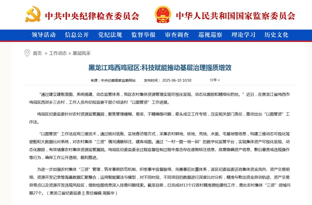 近日,中央纪委国家监委网站刊文《黑龙江鸡西鸡冠区:科技赋能推动基层治理提质增效》,介绍鸡西市鸡冠区纪委监委针对农村资源监管等方面,压实相关部门责任,推动出台“以图管资”工作法有关工作情况。