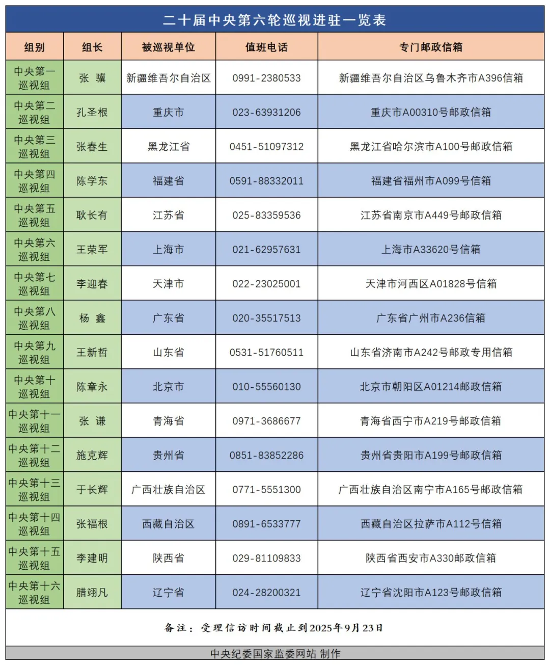 据悉,各中央巡视组将在被巡视地区工作2个半月左右,巡视期间设立专门值班电话和邮政信箱,主要受理反映被巡视党组织领导班子及其成员、下一级党组织主要负责人和重点岗位人员问题的来信来电来访,重点是关于违反政治纪律、组织纪律、廉洁纪律、群众纪律、工作纪律、生活纪律等方面的举报和反映。巡视组受理信访时间截止到2025年9月23日。